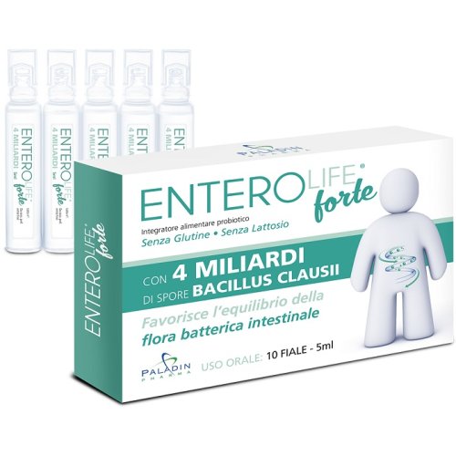 Descrizione Integratore alimentare probiotico. Favorisce l\'equilibrio della flora batterica intestinale. Ingredienti 4 miliardi di spore di Bacillus Clausii DSM 8716. Caratteristiche nutrizionali Valori mediPer fialaPer dose massima giornaliera Bacillus Clausii Acqua depurata Spore non meno di 4 mld UFC* *UFC: Unità Formanti Colonia 8 mld UFC (adulti) = 2 fiale 4 mld UFC (bambini) = 1 fiala Modalità d\'uso Si consigliano le seguenti dosi da assumere preferibilmente a digiuno: - adulti 1 fiala 2 volte al dì - bambini 1 fiala 1 volte al dì In caso di contemporanea somministrazione di terapie antibiotiche, Enterolife va assunto a distanza di almeno 3 ore dall\'antibiotico. Agitare il flaconcino prima dell\'uso. Avvertenze Non superare la dose giornaliera raccomandata. Gli integratori alimentari non vanno intesi come sostituti di una dieta variata ed equilibrata e di uno stile di vita sano. Tenere fuori dalla portata dei bambini al di sotto dei 3 anni di età. Conservazione Conservare in luo fresco ed asciutto, al riparo dalla luce e da fonti di calore. La data di scedenza si riferisce al prodotto correttamente conservato in confezione integra. - Formato 10 fiale da 5 ml Peso netto totale 50 ml Cod. 11008