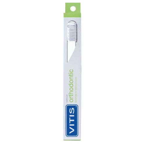 VITIS orthodontic Spazzolino è uno spazzolino per uso quotidiano, con testina di normali dimensioni é con setole morbide e medie. La sua caratteristica principale è che le setole presentano un profilo speciale a forma di V che permette un doppio effetto di pulizia: oltre a pulire le zone di accesso più difficile degli apparecchi ortodontici, in cui si accumulano più facilmente i batteri, si raggiunge anche la zona gengivale.